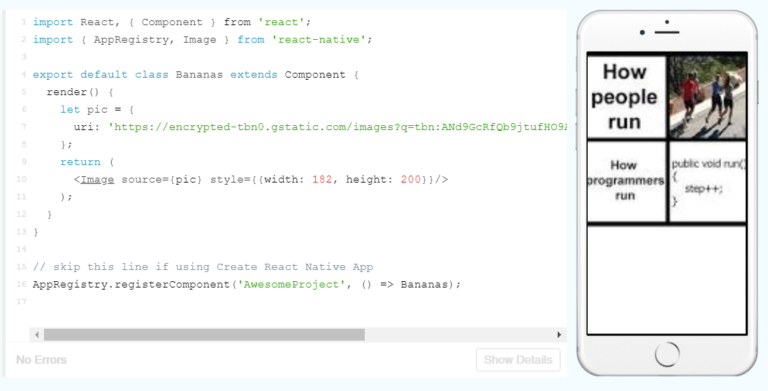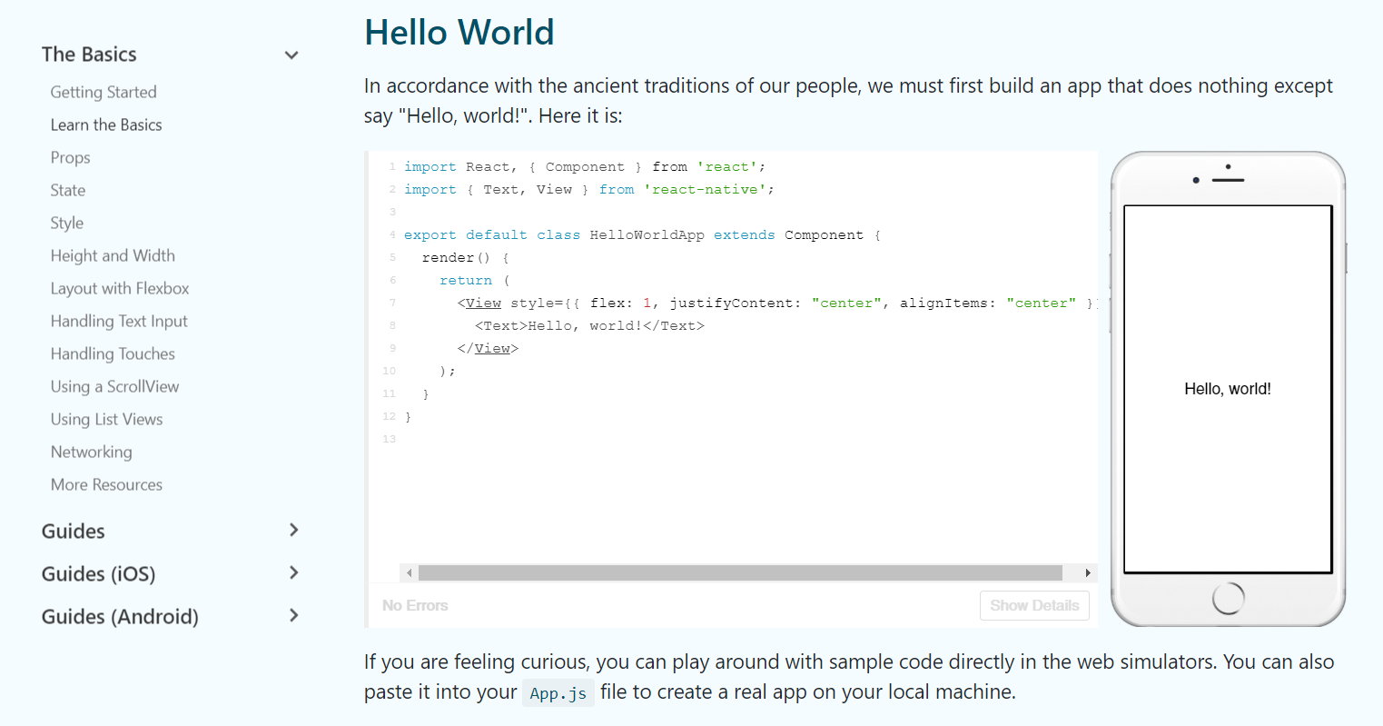 Initially, I thought “Oh, it uses HTML”. Nope, that’s JSX (XML embedded within JavaScript). It is similar to HTML, as it is another markup language, but in this case this it uses React components (i.e. <View> rather than <div> in HTML).