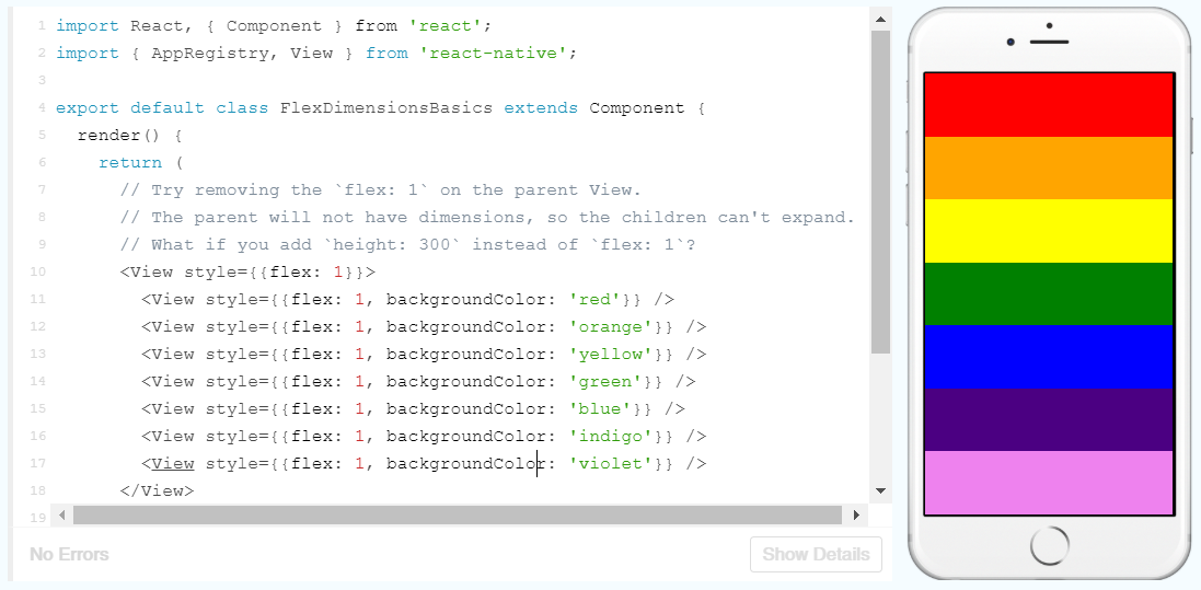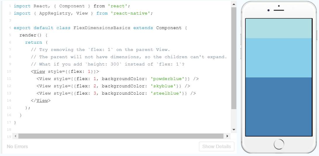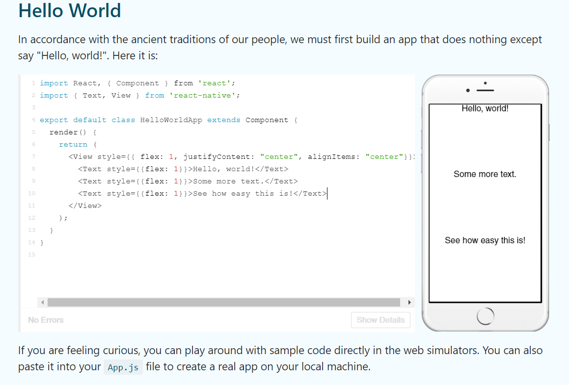 This tells the app to render the words “Hello, world!” with some input on its alignment and position. flex invokes flexbox behaviour which helps create a structure whilst letting the elements be dynamically sized to accommodate various screen sizes and dimensions.