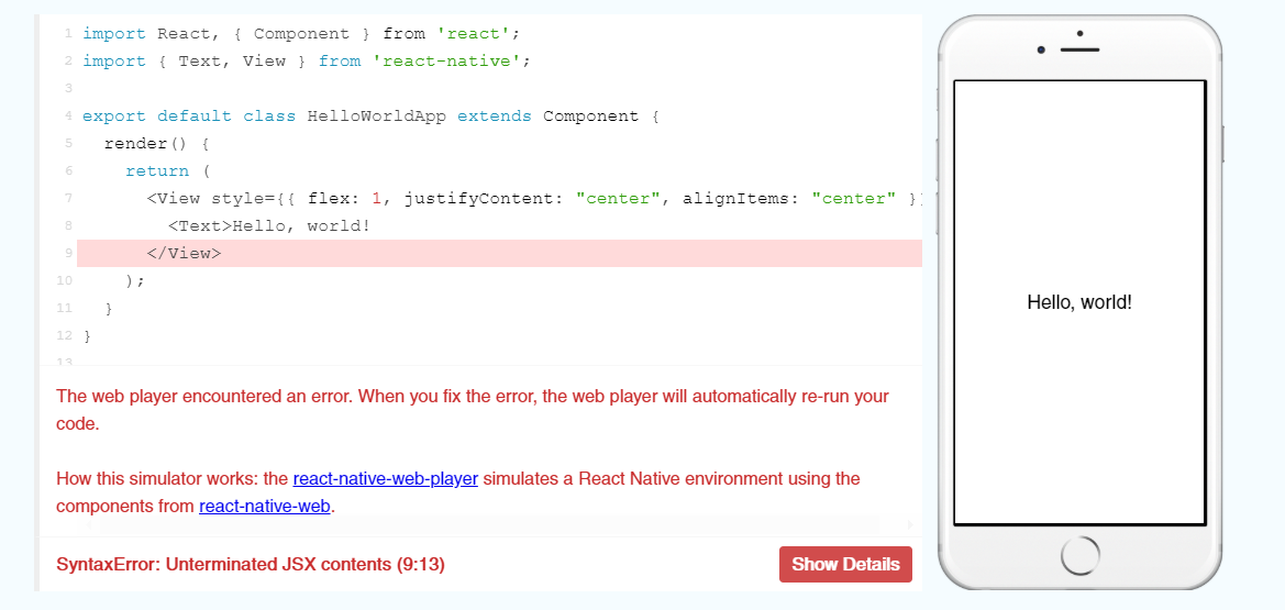 Also, as you may have noticed in the picture above, the JSX elements must be opened and closed. Let’s see what happens if I delete the </Text>: