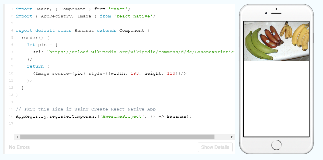 As you can see here, the width and height have specified dimensions. This is useful for components such as images, that should always render at the same size. Otherwise, we could dynamically set the height using flex: