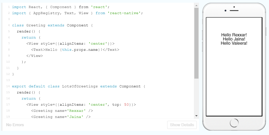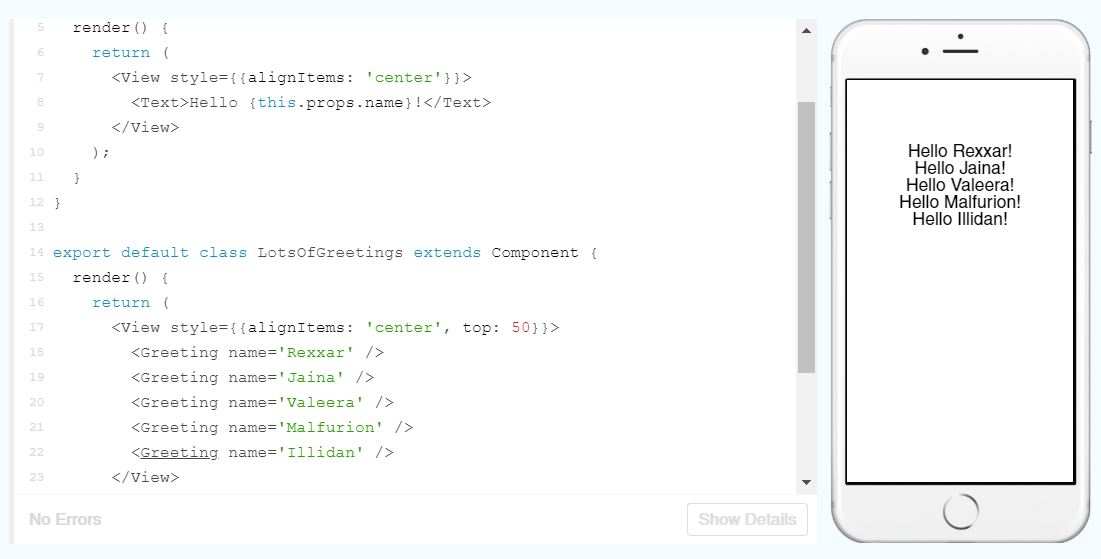 Here, the first class Greeting is setting up a template for the greeting and a prop is being used in place of the name. The names are then populated in the LotsOfGreetings class (which the Facebook team just so happened to give a Warcraft theme!). I should be able to just add more names to render more greetings on the app: