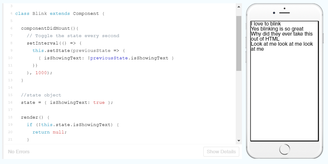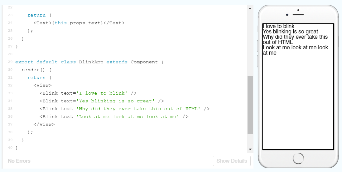 In this example, the class Blink is being used to set the state of the props text set in the class BlinkApp. Sounds confusing, so lets break it down: