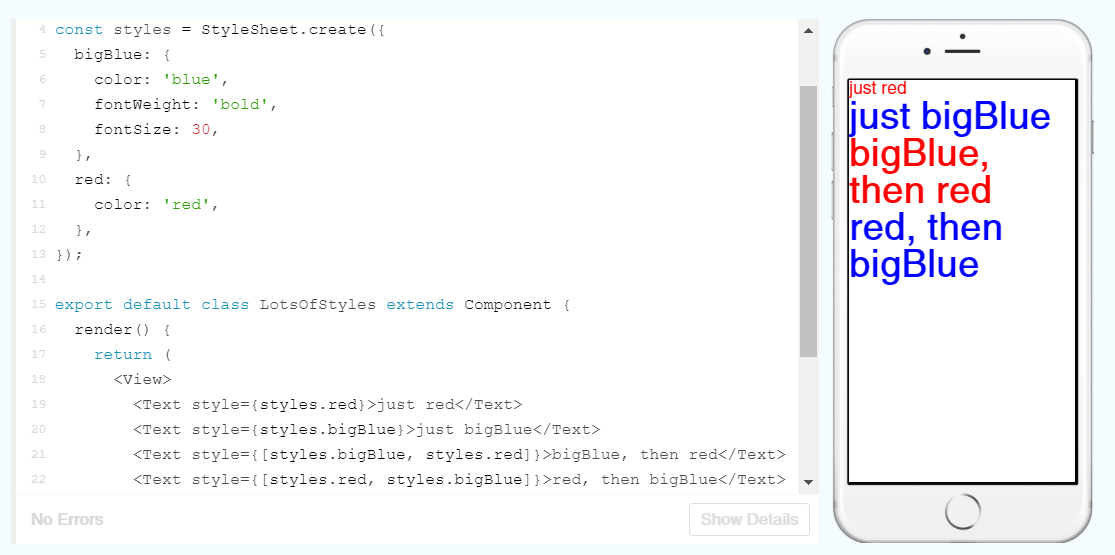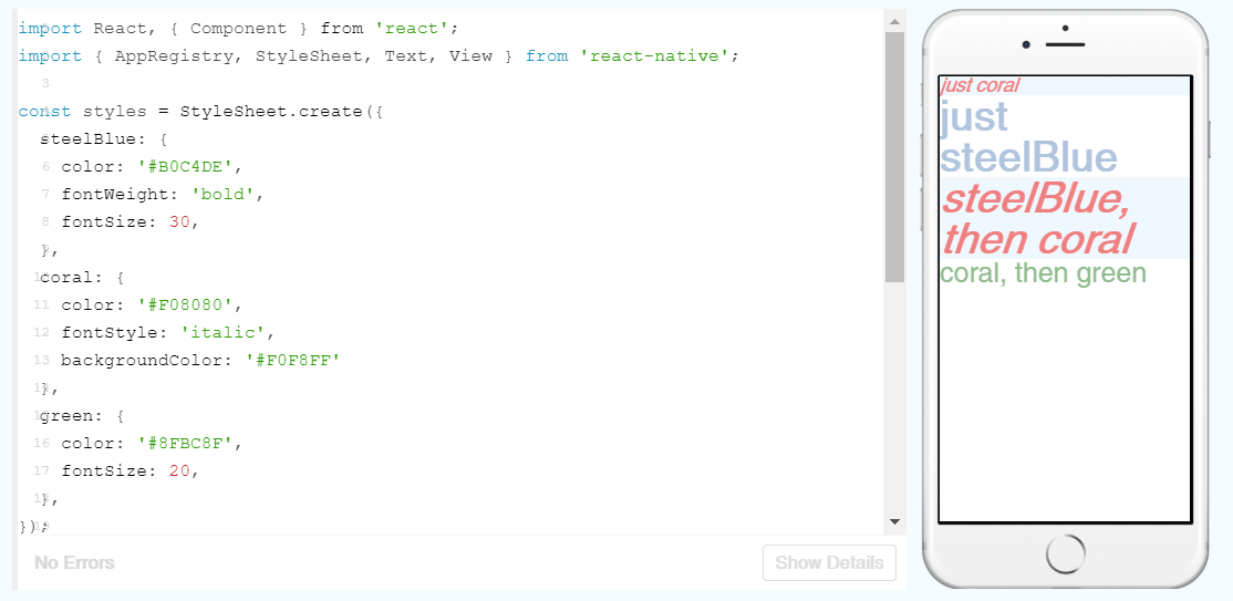 Using a StyleSheet to define the styles and subsequently use these in the text makes for easy designing. A few changes to this StyleSheet and updating of names within the Text elements and we can change the colour, weight and size of the fonts.