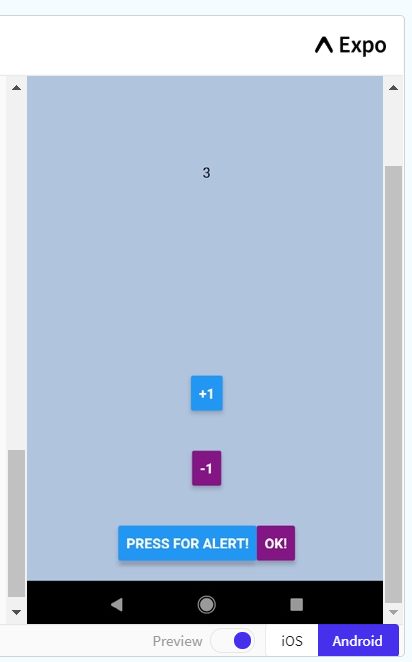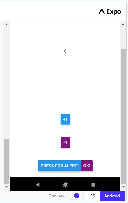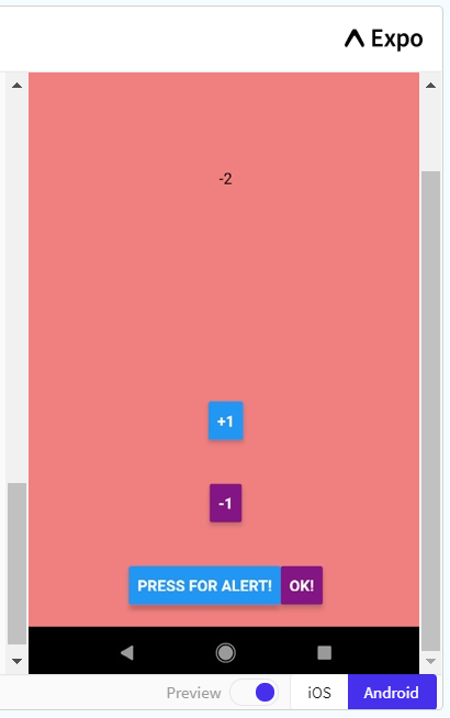 Firstly, I’ve added the counter into the View so that you can see it. I put the state within a Text component and centered it on the screen. The rest of it is very similar apart from changing the onPress action and the title of the buttons to represent what they do.
