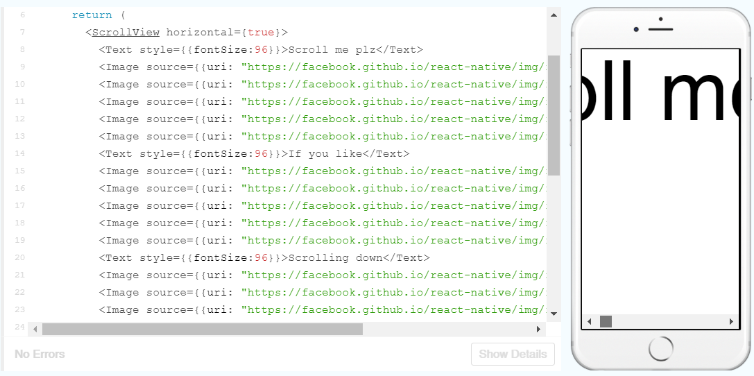 By simply adding the horizontal prop to the ScrollView we can also scroll horizontally like so: