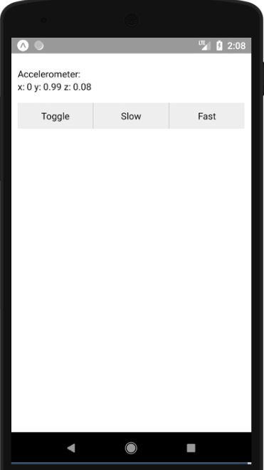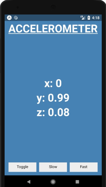 Just as I explained about the code, pressing the toggle button stops the accelerometer data updating, slow makes it update less often (once per second) and fast makes it update more often (60 times per second).